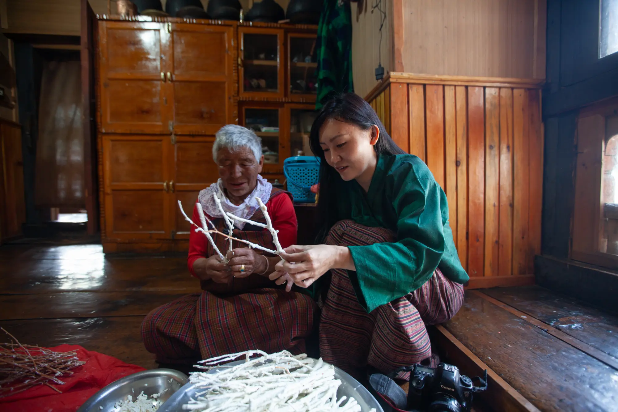 I was lucky enough to be invited to a homestay in Yangthang village to witness in person how Philu is made. Aum Sangay first layers a thick coat of yoghurt on the twigs inside the bucket. She makes sure each twig is covered by the yoghurt.