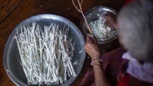 I was lucky enough to be invited to a homestay in Yangthang village to witness in person how Philu is made. Aum Sangay first layers a thick coat of yoghurt on the twigs inside the bucket. She makes sure each twig is covered by the yoghurt.