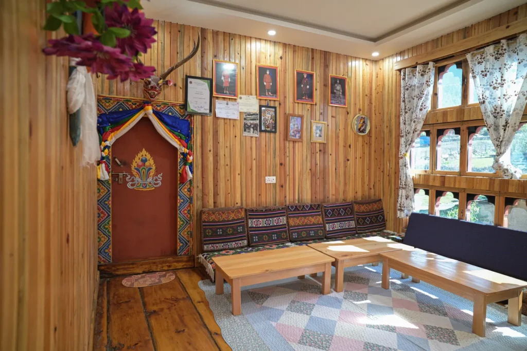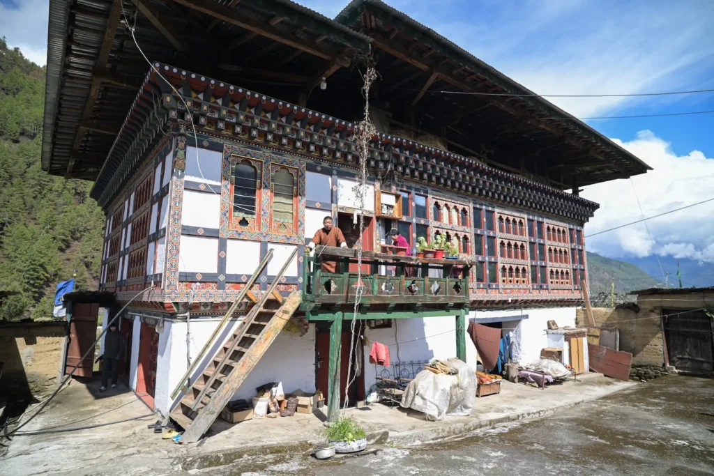 Kelzang Dawa Homestay is situated in Katsho, conveniently located just above the road, making it easily accessible for visitors. The house stands out with its clean, whitewashed exterior accented by traditional Bhutanese decorative motifs, offering a pleasing blend of simplicity and cultural character.