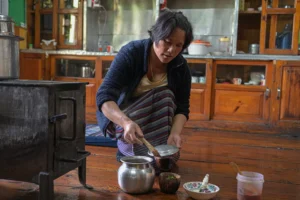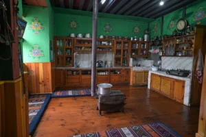 Entering Ap Ugyen’s homestay in itself is an experience. Push open the wooden door (with traditional latch system) and you will arrive at a small courtyard with mini sitting areas. Then as you climb up the ladder, you will notice the many traditional sporting equipment arranged on the wall. Then as you proceed onto the hall, you cannot help but think that this hall in itself could be a museum. Many bronze, bamboo and wooden utensils are arranged on the shelves. They have a spacious living room and kitchen attached. You must ask for their Kabchi breakfast spread for a traditional way to start the day.