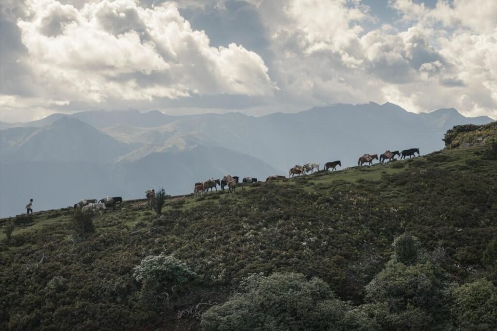 It was windy and cold, probably typical for a September morning at this altitude. While hundreds of prayer flags fluttered wildly in the wind, we launched our drones. The view on the remote-control screen was fascinating, even though the weather god denied us a wish today: The famous snow-covered giants of the Himalayas on the horizon remained hidden behind a thick wall of clouds. But that didn’t ruin the mood. From up there, the world still looked majestic. From above we saw how the road wound like an endless ribbon thru the green mountains. A little further away, on the steep hills, we then discovered a transport of goods with packhorses. The small silhouettes climbed the mountain paths undeterred. This spectacular bird’s-eye view, with the rugged beauty of the cloud-covered mountain region, was a moment that made all the effort worthwhile.